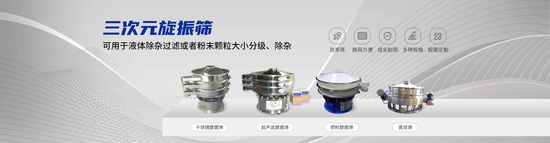 公司的主要產(chǎn)品有:三次元旋振篩、直線振動篩、圓形搖擺篩、方形搖擺篩、脫水篩、超聲波振動篩、塑料振動篩、直排篩、高頻篩、450過濾篩、實驗篩、斗式提升機、皮帶輸送機、過濾器、振動電機等,